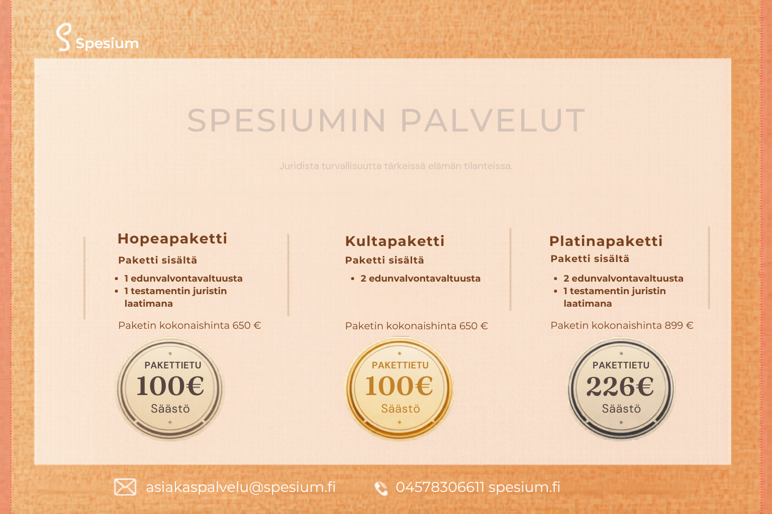 Spesium auttaa laatimaan edunvalvontavaltuutuksen selkeästi, turvallisesti ja sinun elämäntilanteeseesi sopivaksi. Meidän tehtävämme on tehdä vaikeista juridisista asioista ymmärrettäviä ja auttaa silloin, kun oikea tuki tuo eniten varmuutta.